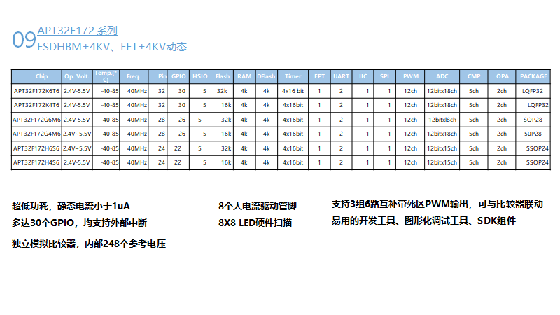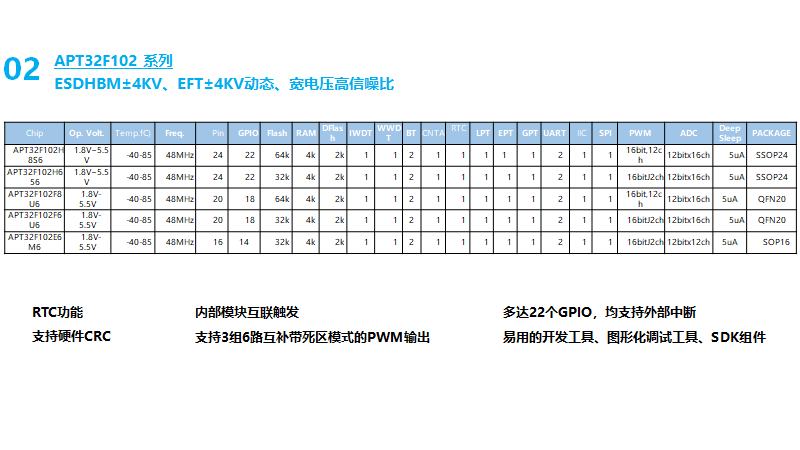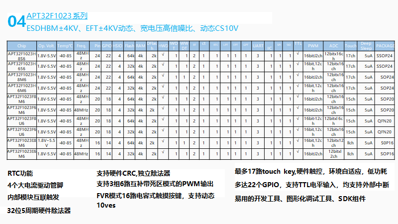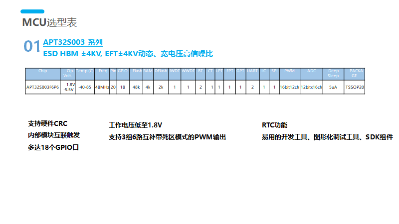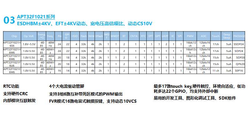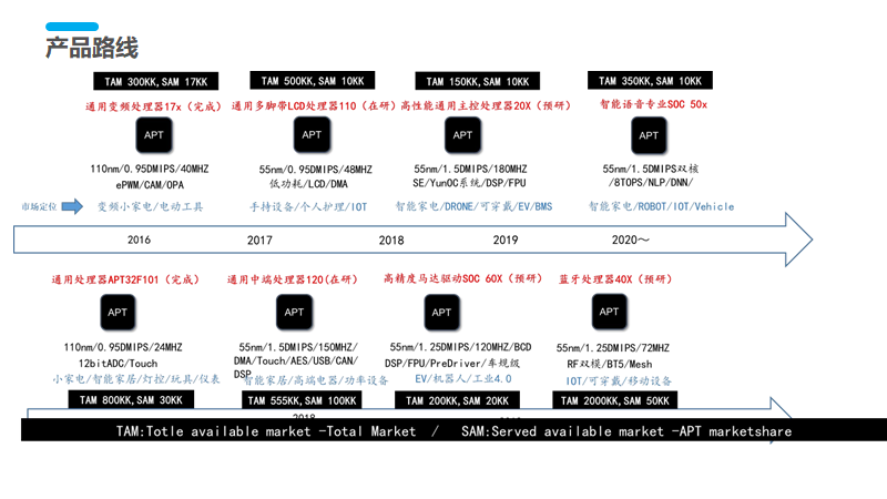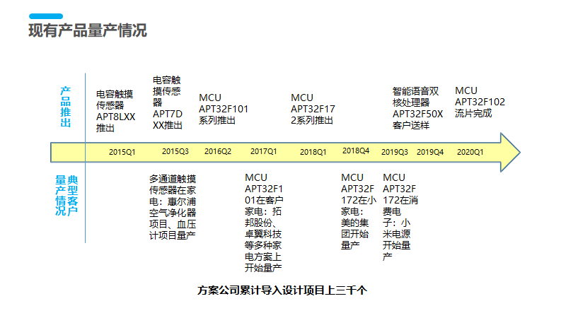 深圳市爱普特微电子有限公司(APTCHIP)是一家专注于高性能32位微处理器(MCU)、SoC及电容式触控传感器等周边IC设计的国家级高新技术企业,2017年获评“中国半导体民族品牌”。公司成立于2012年,由 半导体行业集成电路设计及行业资深人士联合组建,总部位于深圳,在杭州、香港设有分支机构及联络处。爱普特APTCHIP以强大的数字与模拟混合集成电路设计能力,自主研发了多项专利及专有技术,推出 了32位微处理器和电容触摸传感器系列产品。公司产品贴合市场需求,以多品种、易于开发等优势得到了客户的广泛认同,产品成本在行业同类型 中最低,利润率高,竞争力强,目前市场占有率国内位居第一。公司通过IOS9001质量体系认证,APT32F系列 MCU及Touchsensor在国内外家电领域客户,如美的、小米、百度、九阳、苏泊尔、海尔、LG等不断得到了运用 推广,每年达产数十KK级出货量。爱普特公司深耕市场需求,引领芯片客制化设计潮流,将持续为业界提供高性能MCU系列芯片及定制 Soc芯片,成为国际同行业中技术研发实力最全面、应用设计最广泛的公司之一。