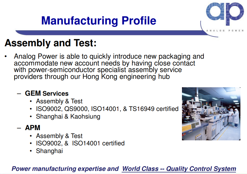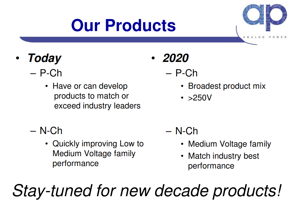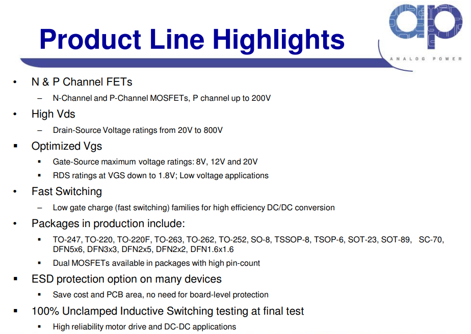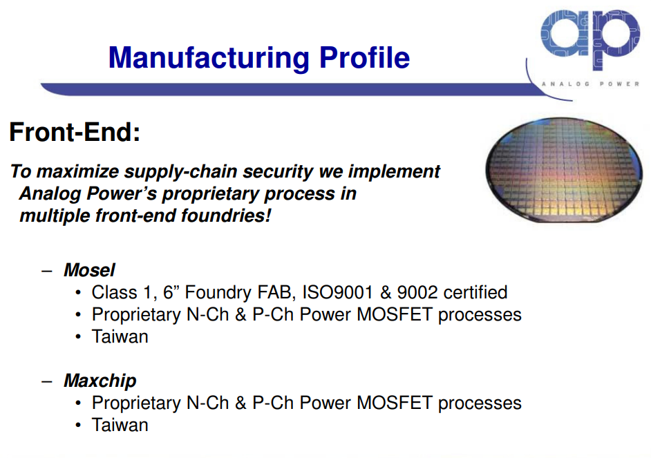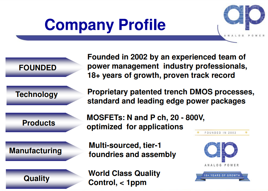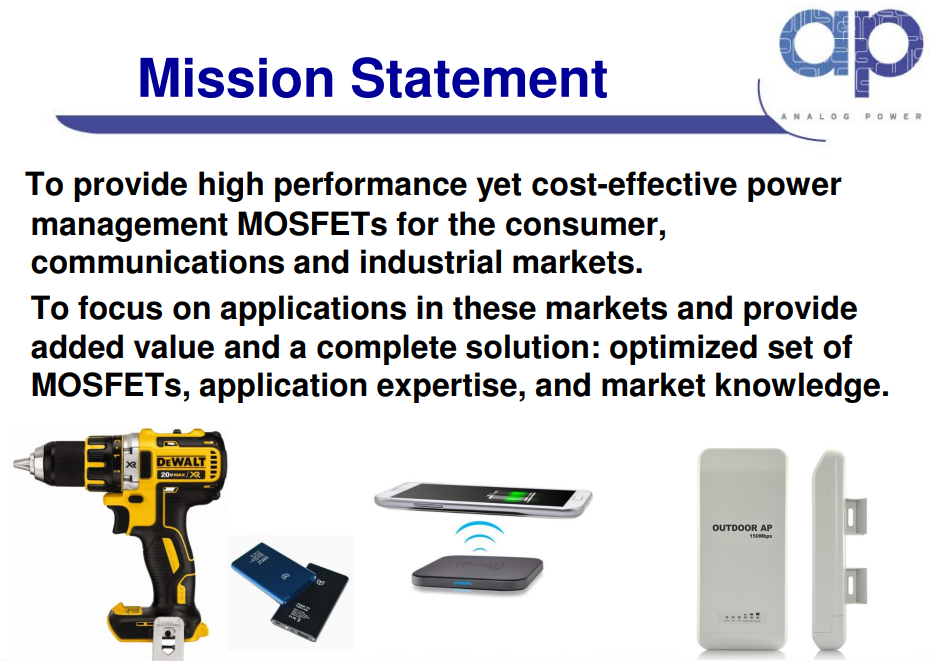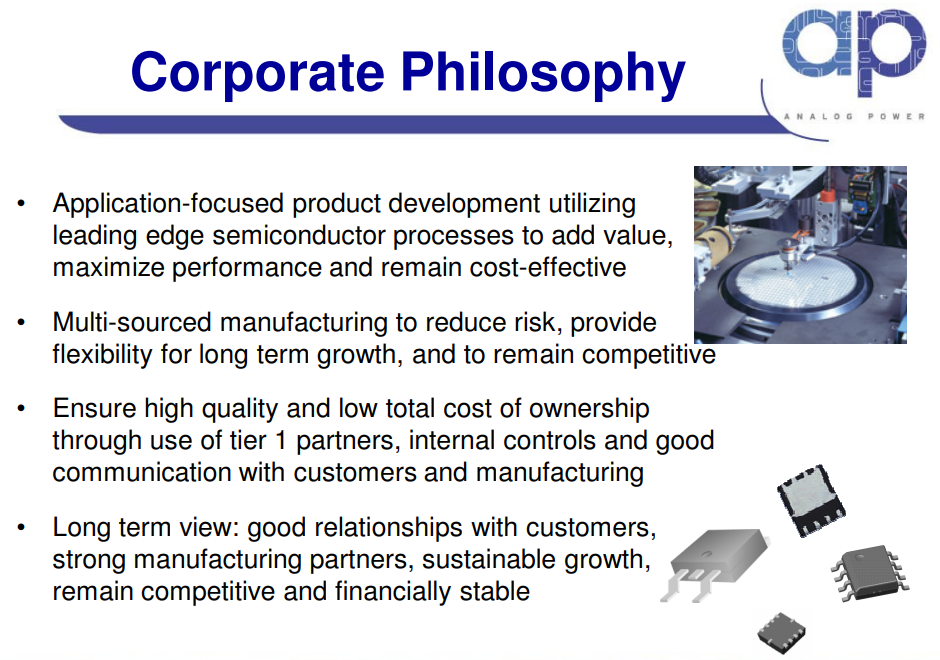 通过使用行业领先的制造合作伙伴,Analog Power的产品与市场上更大、更多样化的供应商采用相同的标准。Analog Power的员工以客户为导向,在功率半导体方面有很高比例的工程师经验。Analog Power将利用其市场和应用知识以及客户反馈继续扩大其产品组合。