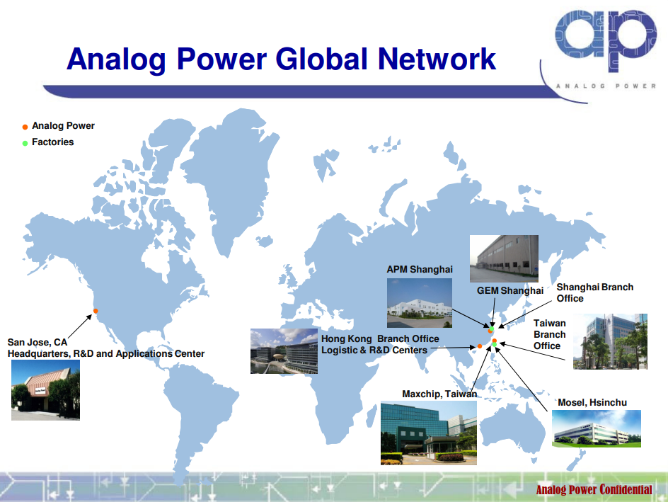 成立于2002年,专注于电源管理,并为客户提供最优的产品。公司在美国(加州圣何塞)、香港和台湾设有办事处,拥有广泛的代表网络,覆盖全球大部分半导体市场。
